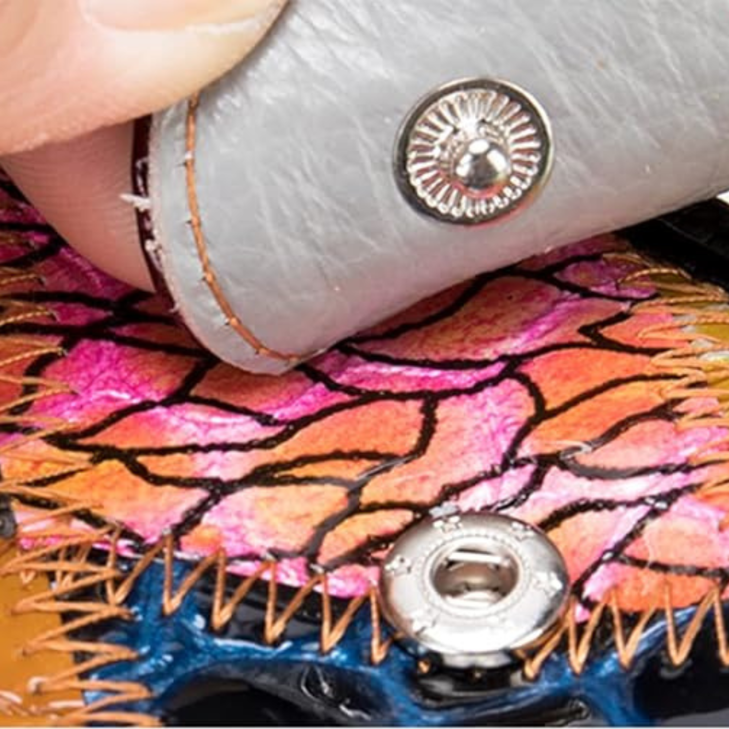Das Besondere an dieser Geldbörse ist ihr einzigartiges Patchwork-Design. Wie bei einem Mosaik werden sorgfältig ausgewählte Stücke aus echtem Rindsleder in unterschiedlichen Farben und mit verschiedenen Oberflächenstrukturen kunstvoll zusammengenäht. Von glänzendem Lackleder über genarbtes Leder bis hin zu Stücken mit Krokodilprägung entsteht so ein harmonisches und doch aufregendes Gesamtbild.
