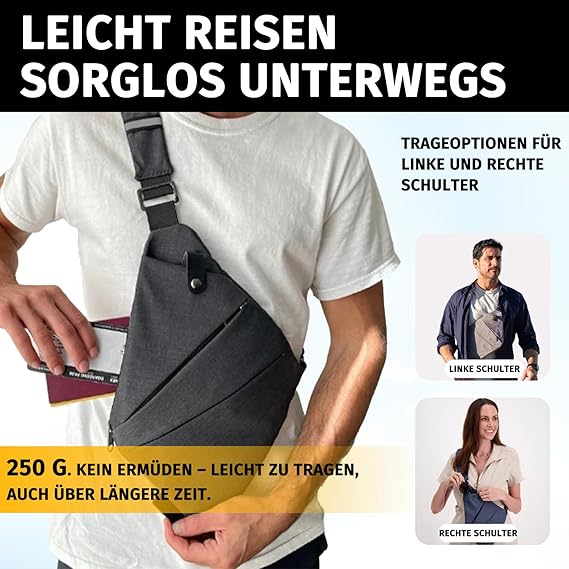 Eine diebstahlsichere Tasche ist heutzutage mehr als nur ein modisches Accessoire; sie ist ein unverzichtbarer Begleiter fĂŒr jeden, der seine Wertsachen in der Hektik des Alltags oder auf Reisen schĂŒtzen möchte. Jeder kennt das ungute GefĂŒhl im GedrĂ€nge, die stĂ€ndige Sorge um Smartphone, Geldbörse und SchlĂŒssel auf vollen PlĂ€tzen oder in öffentlichen Verkehrsmitteln. Genau fĂŒr diese Momente wurde diese Tasche entwickelt. Sie kombiniert ein HöchstmaĂ an Sicherheit mit einem urbanen, minimalistischen Design und auĂergewöhnlichem Tragekomfort. Somit können Sie sich frei und unbeschwert bewegen, denn Ihre Wertsachen sind sicher und direkt am Körper verstaut.