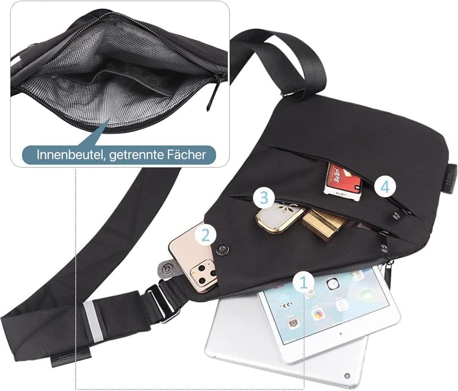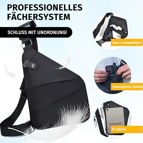 Diese durchdachte Funktion maximiert den Nutzungskomfort erheblich. Der Gurt ist zudem flexibel und leicht verstellbar, sodass Sie die Tasche perfekt an Ihre KörpergröĂe und Ihre bevorzugte Trageposition anpassen können â ob eng an der Brust fĂŒr maximale Sicherheit oder etwas lockerer auf der HĂŒfte.