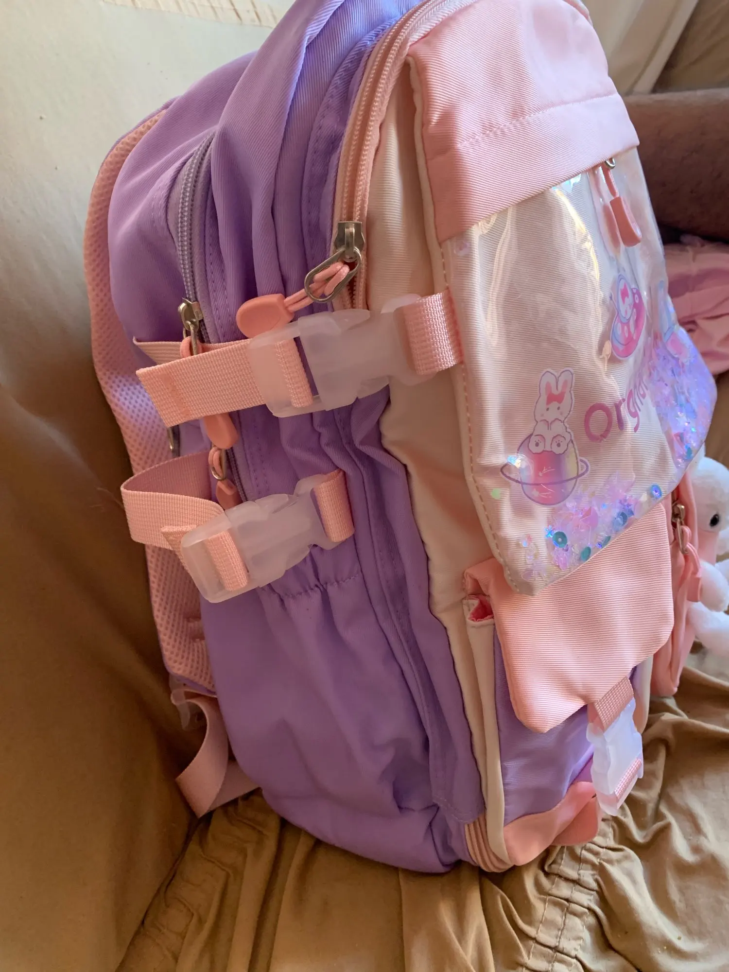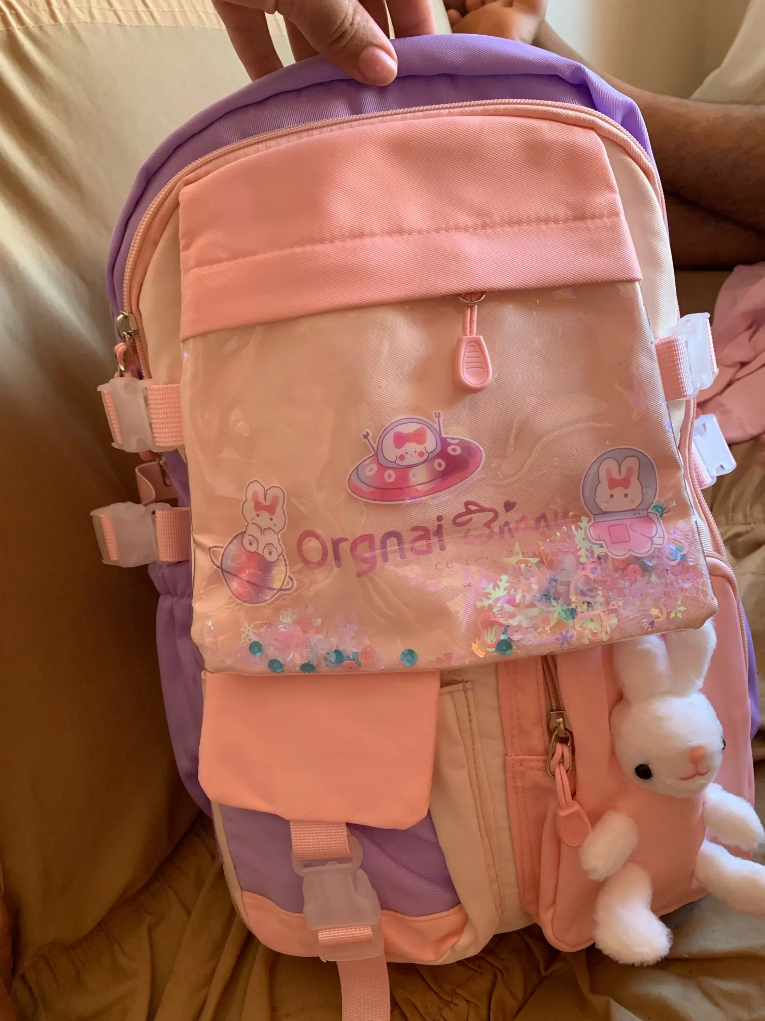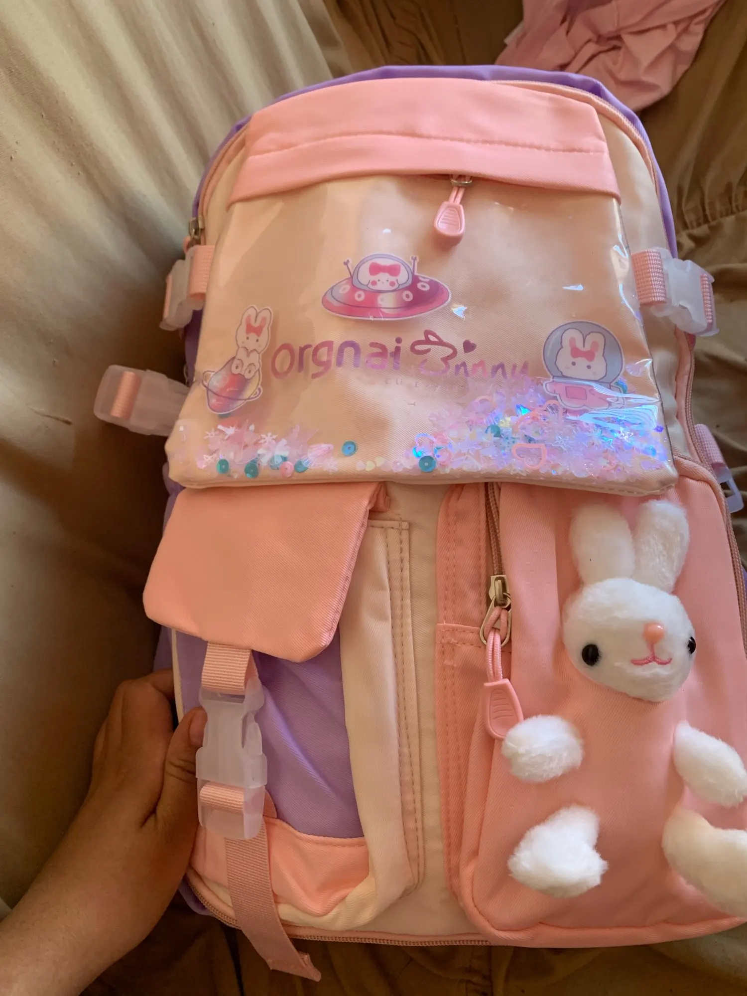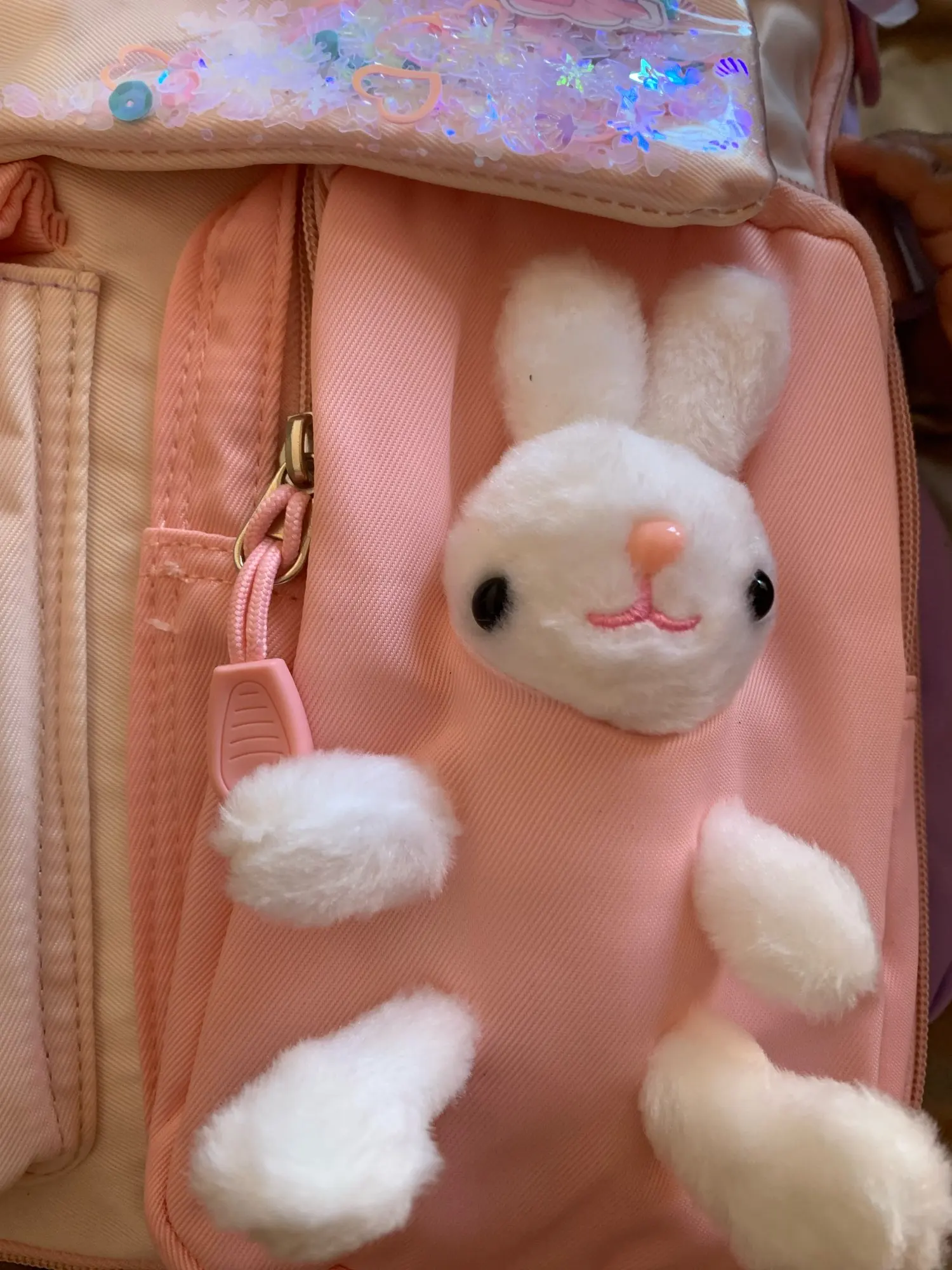 Das „Kawaii“-Design ist liebevoll und verspielt, ohne überladen zu wirken. Ein besonderes Highlight ist die transparente Vordertasche, die mit bunten Pailletten und Perlen gefüllt ist und bei jeder Bewegung fröhlich funkelt. Ein abnehmbarer, weicher Plüschhase ziert eine der Vordertaschen und wird schnell zum treuen Begleiter und Glücksbringer für den Schulalltag. Dieser schulrucksack mädchen ist mehr als nur eine Tasche; er ist ein modisches Statement und ein Stück „wundervolle Kindheit“, das Ihre Tochter mit Stolz tragen wird.